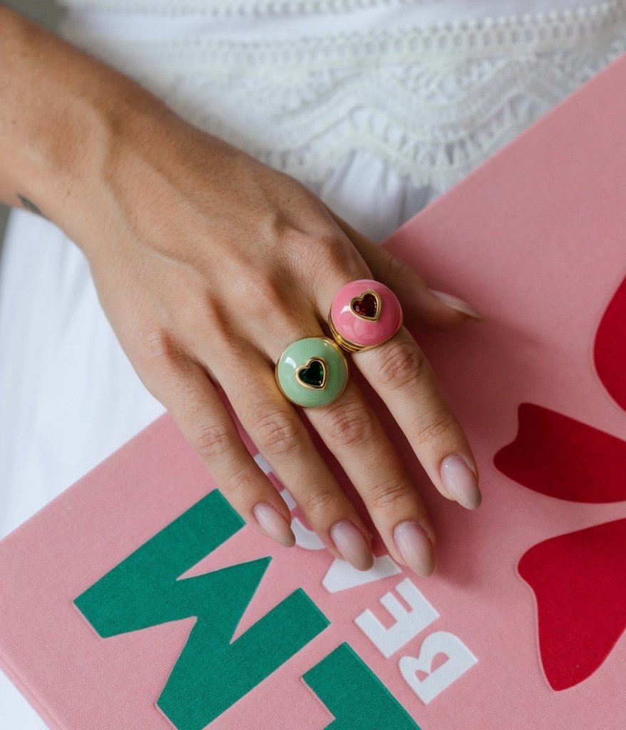 Anel robusto com esmaltação italiana na cor rosa, e ao centro, coração com zircônia rubelita, folheado a ouro 18K.