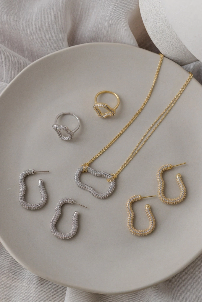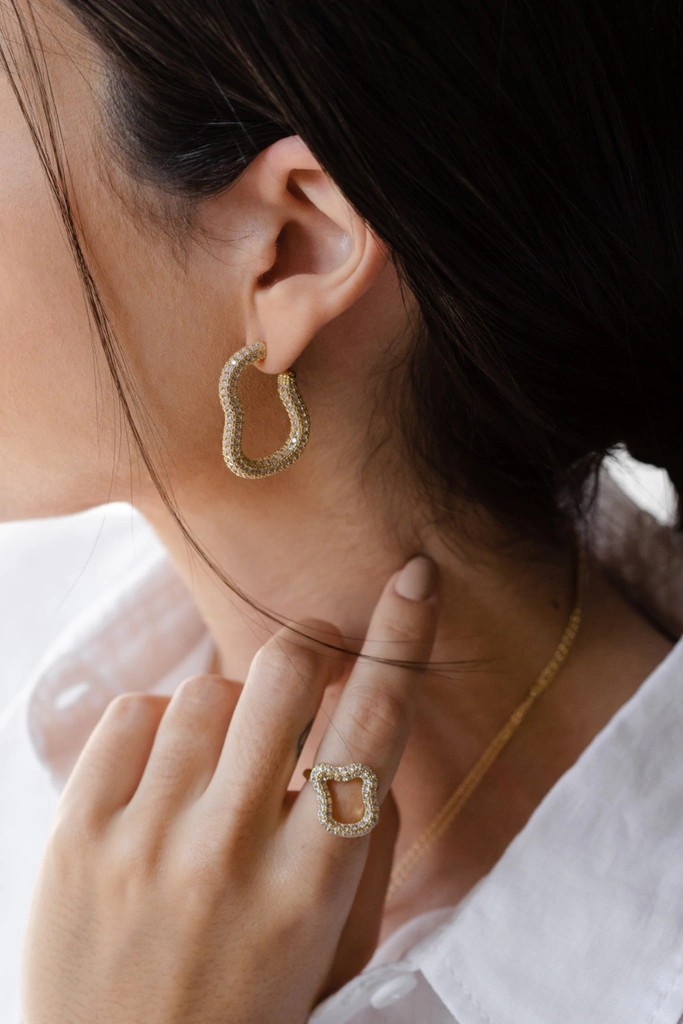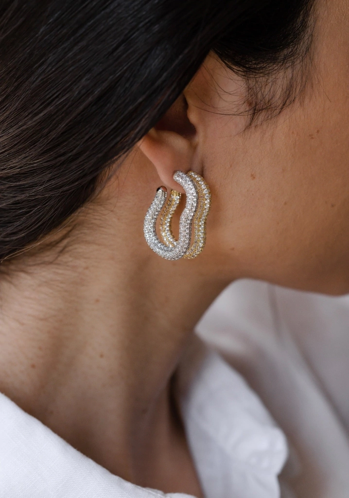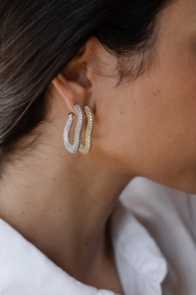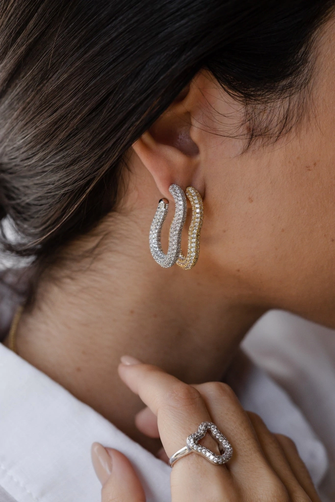 Brinco argola com design artsy, cravejada com zircônias brancas, folheada a ouro 18K. Medida interna: 2,5cm x 1cm