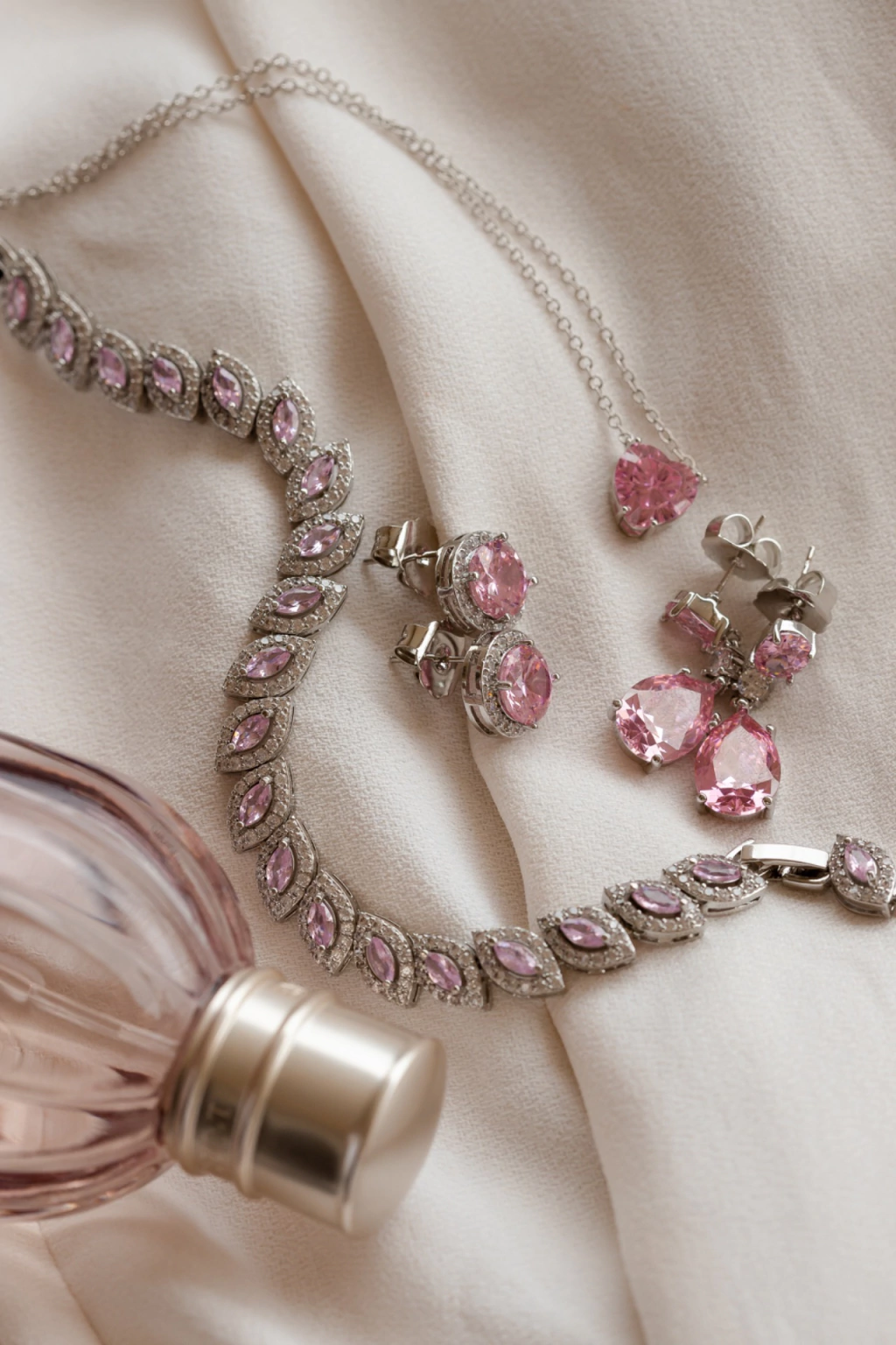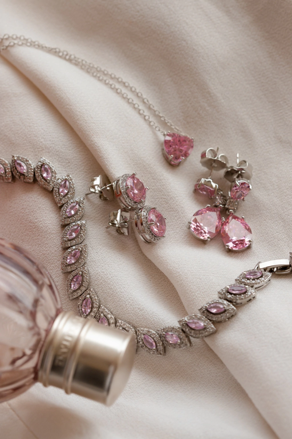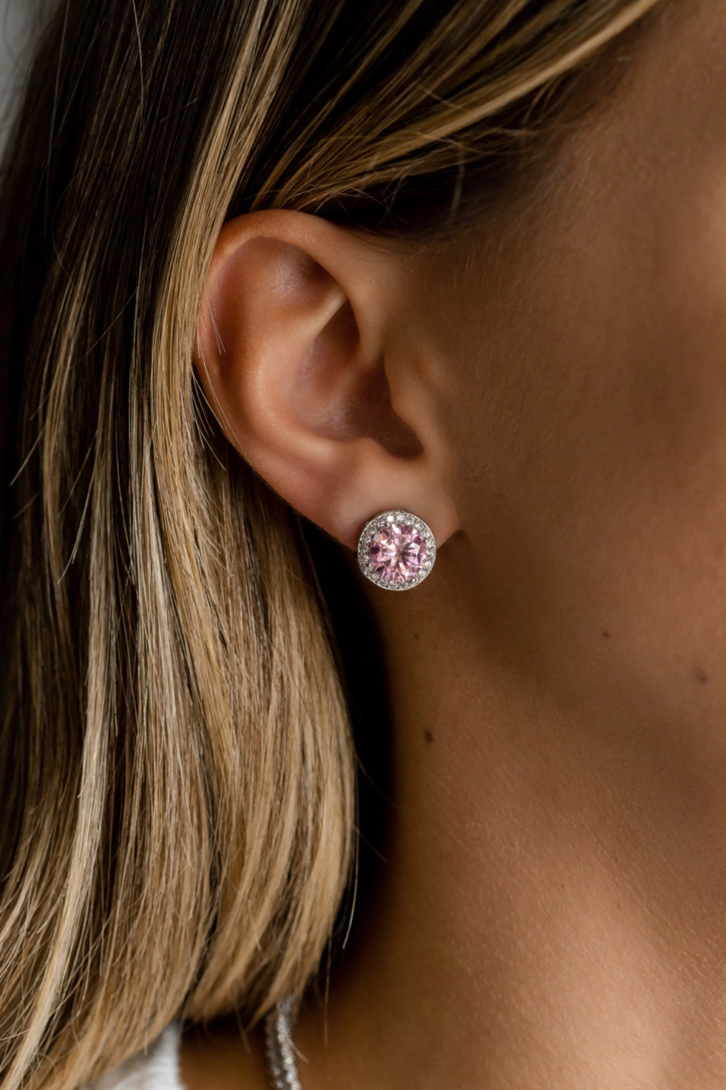 Brinco botão, com zircônia kunzita na parte central e lateral cravejada com zircônias brancas, folheado a ródio.
