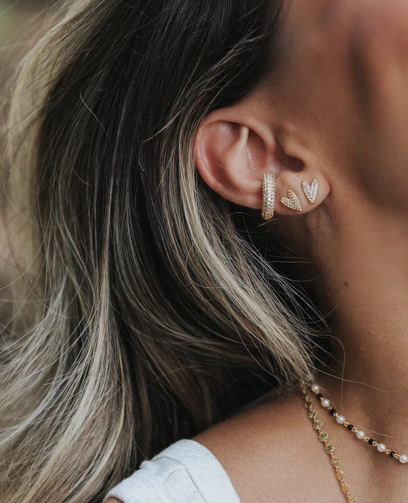 Brinco em formato de coração, folheado a ouro 18k, com cravejação de zirconias brancas