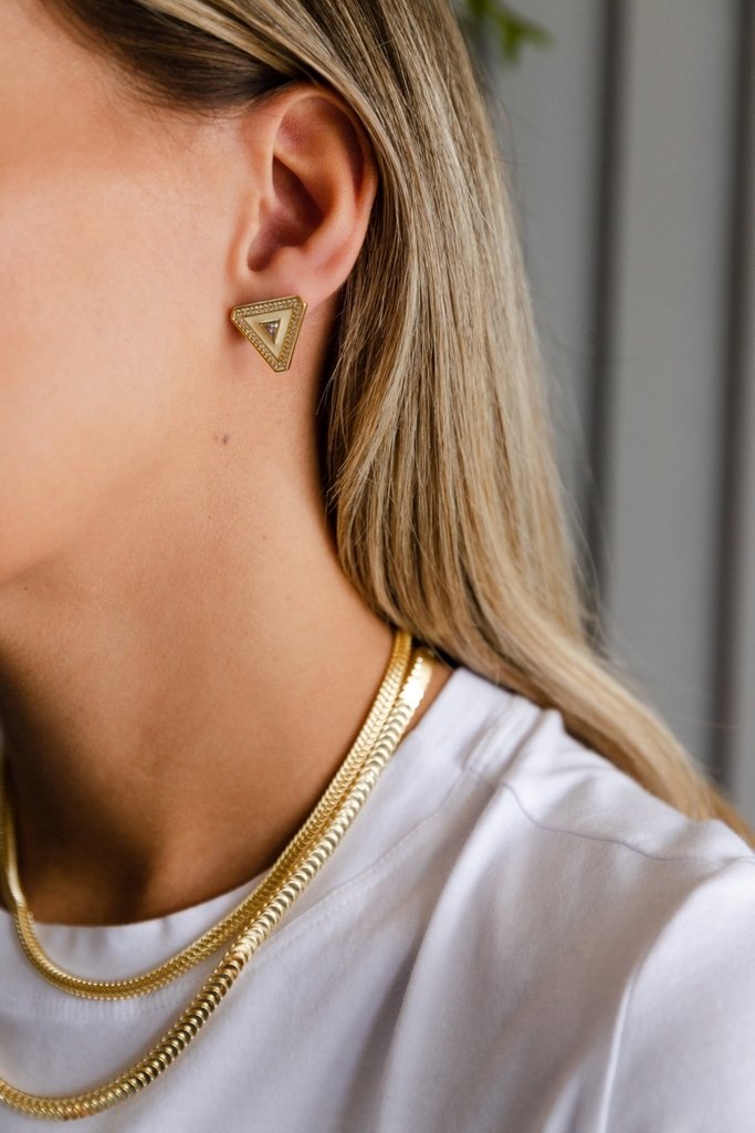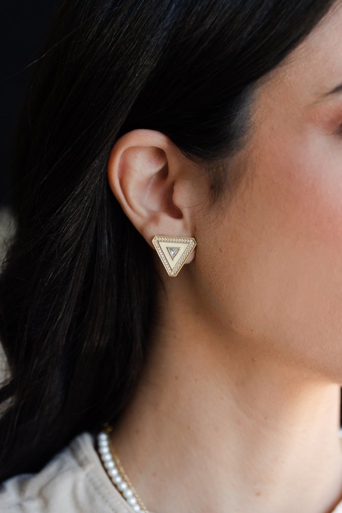 Brinco com formato de triângulo, folheado a ouro 18K, com esmaltação italiana na cor branca e cravação de zircônias brancas.