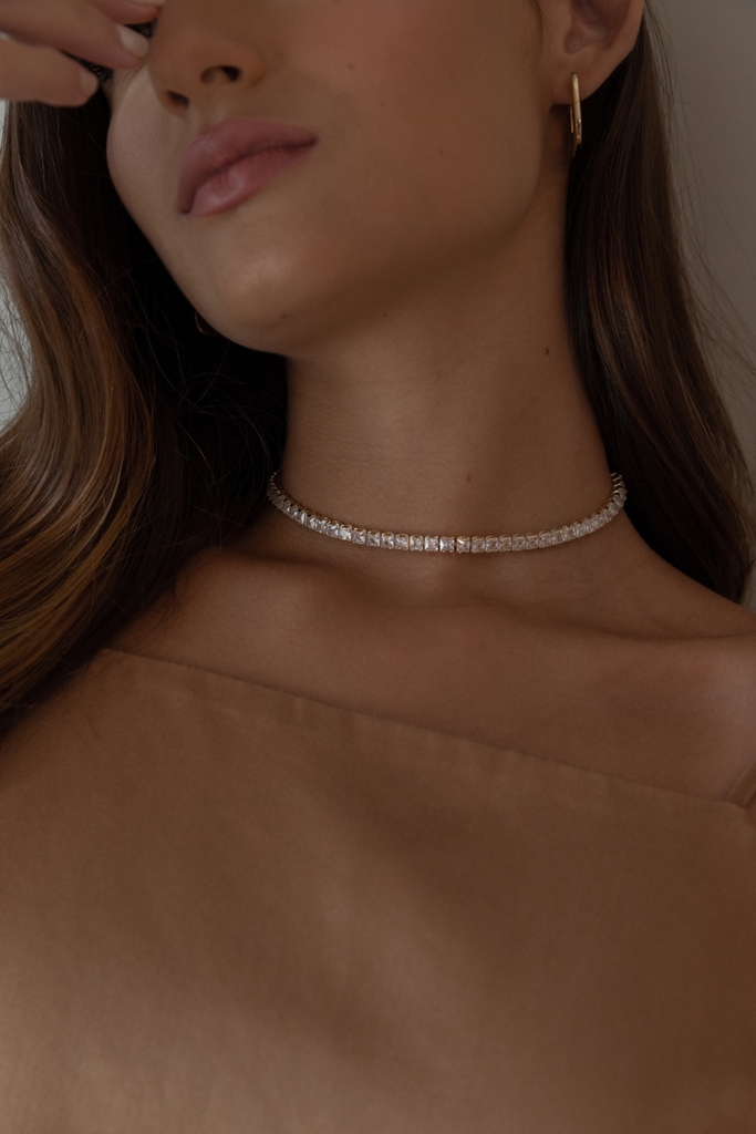 Chocker cravejada com zircônias retangulares, folheada a ouro 18k.
