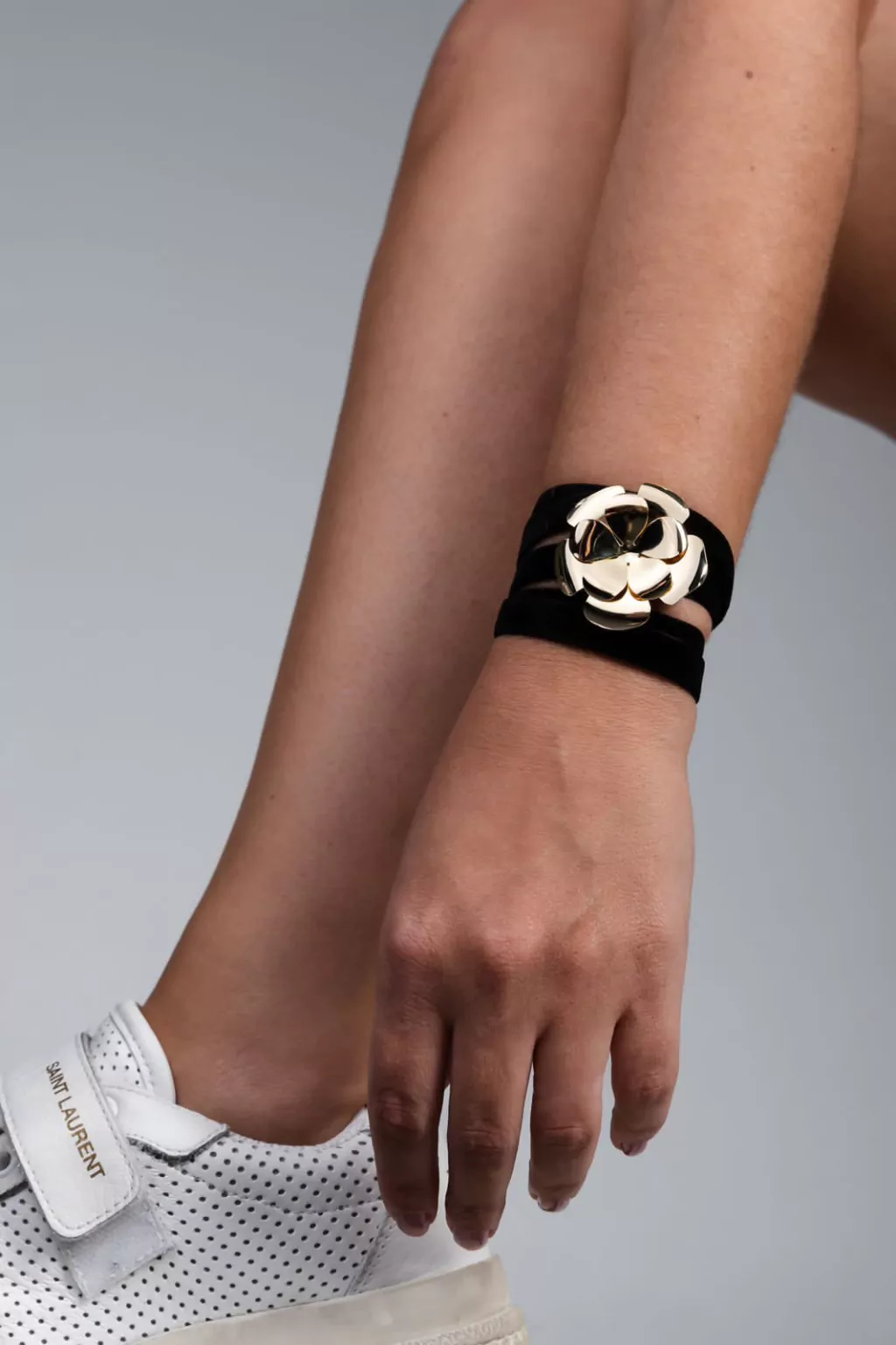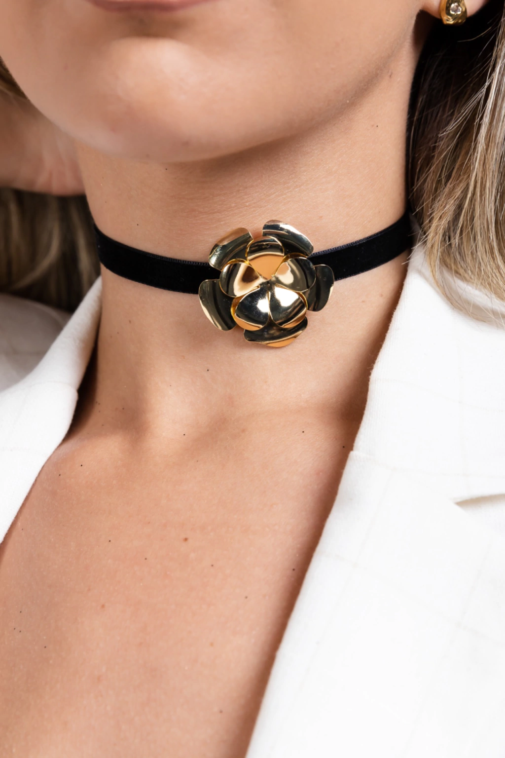 Colar de veludo na cor preta, com pingente em formato de flor, folheado a ouro 18K.